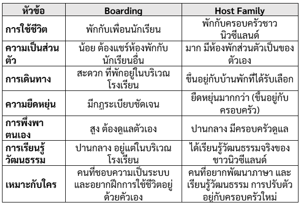 การไปเรียนต่อ หรือ เรียนแลกเปลี่ยนที่ประเทศนิวแลนด์เป็นความฝันของนักเรียนไทยหลาย ๆ คน โดยเฉพาะน้อง ๆ ที่ต้องการหาประสบการณ์ใหม่ ๆ พร้อมพัฒนาภาษาอังกฤษไปด้วย แต่สิ่งที่เป็นเรื่องยากสำหรับน้อง ๆ และผู้ปกครองอีกอย่างหนึ่งคือ จะเลือกไปเรียนโรงเรียนประจำ พักหอโรงเรียน (Boarding) หรือ เลือกเรียนโรงเรียนธรรมดา พักกับครอบครัวโฮสต์ (Host Family) แม้ทั้งสองตัวเลือกจะเป็นตัวเลือกที่ดีทั้งคู่ แต่ก็จะมีลักษณะเด่นแตกต่างกันไป บทความนี้จึงจะมาพูดถึงความแตกต่างของสองระบบนี้กันค่ะ