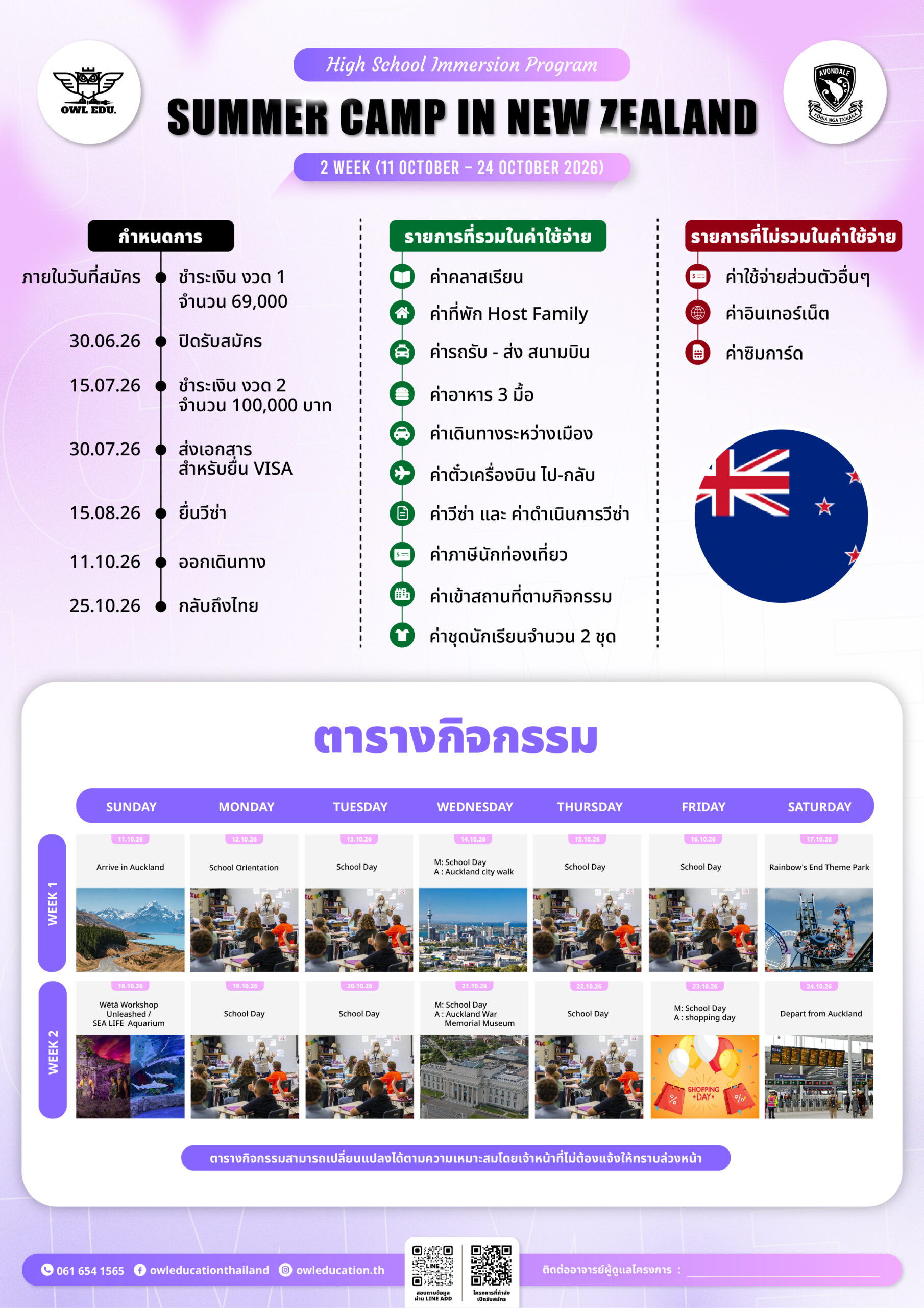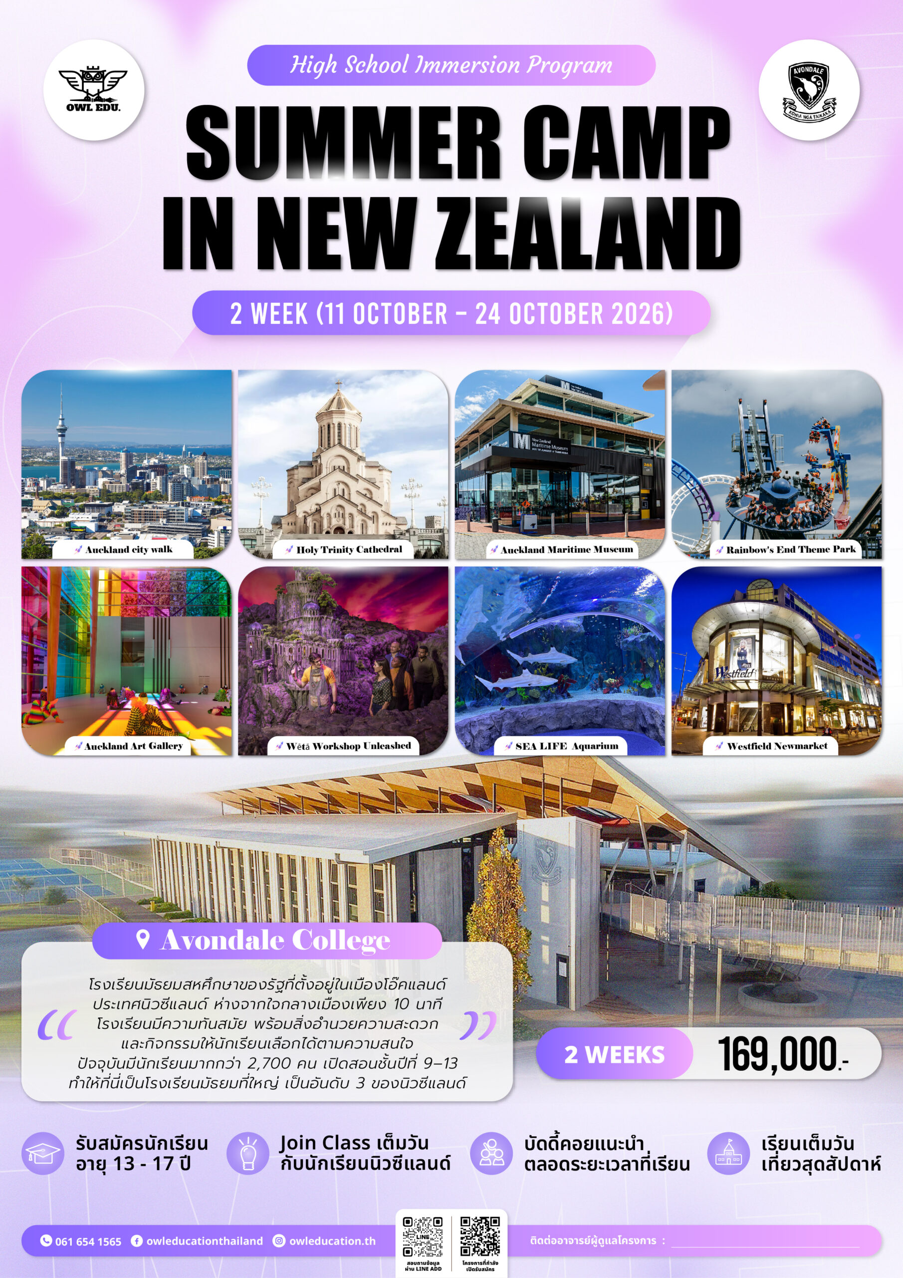 ไป Summer Camp in New Zealand กับพี่ Owl Education Thailand เดินทางไปสัมผัสชีวิตนักเรียนมัธยมในประเทศนิวซีแลนด์ เข้าเรียนเต็มวันกับเพื่อนชาวกีวี และเพื่อนต่างชาติอีกหลากหลายประเทศ เสมือนเป็นนักเรียนแลกเปลี่ยนจริงพร้อมบัดดี้ชาวกีวี่คอยแนะนำตลอดระยะเวลาที่เรียน เรียนรู้วัฒนธรรมด้วยการพักกับโฮสต์ชาวกีวี่แท้ๆ และ สุดพิเศษกับโปรแกรมเที่ยวเต็มวัน